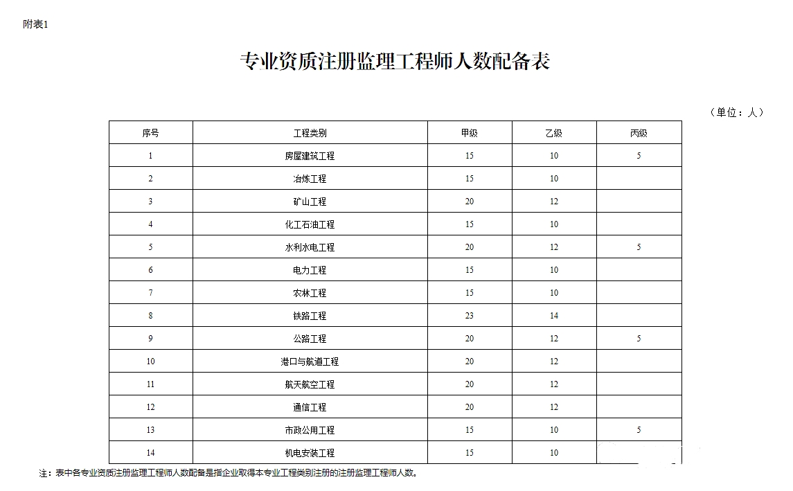 (3)相應(yīng)專業(yè)的注冊(cè)監(jiān)理工程師不少于《專業(yè)資質(zhì)注冊(cè)監(jiān)理工程師人數(shù)配備表》(附表1)中要求配備的人數(shù)。