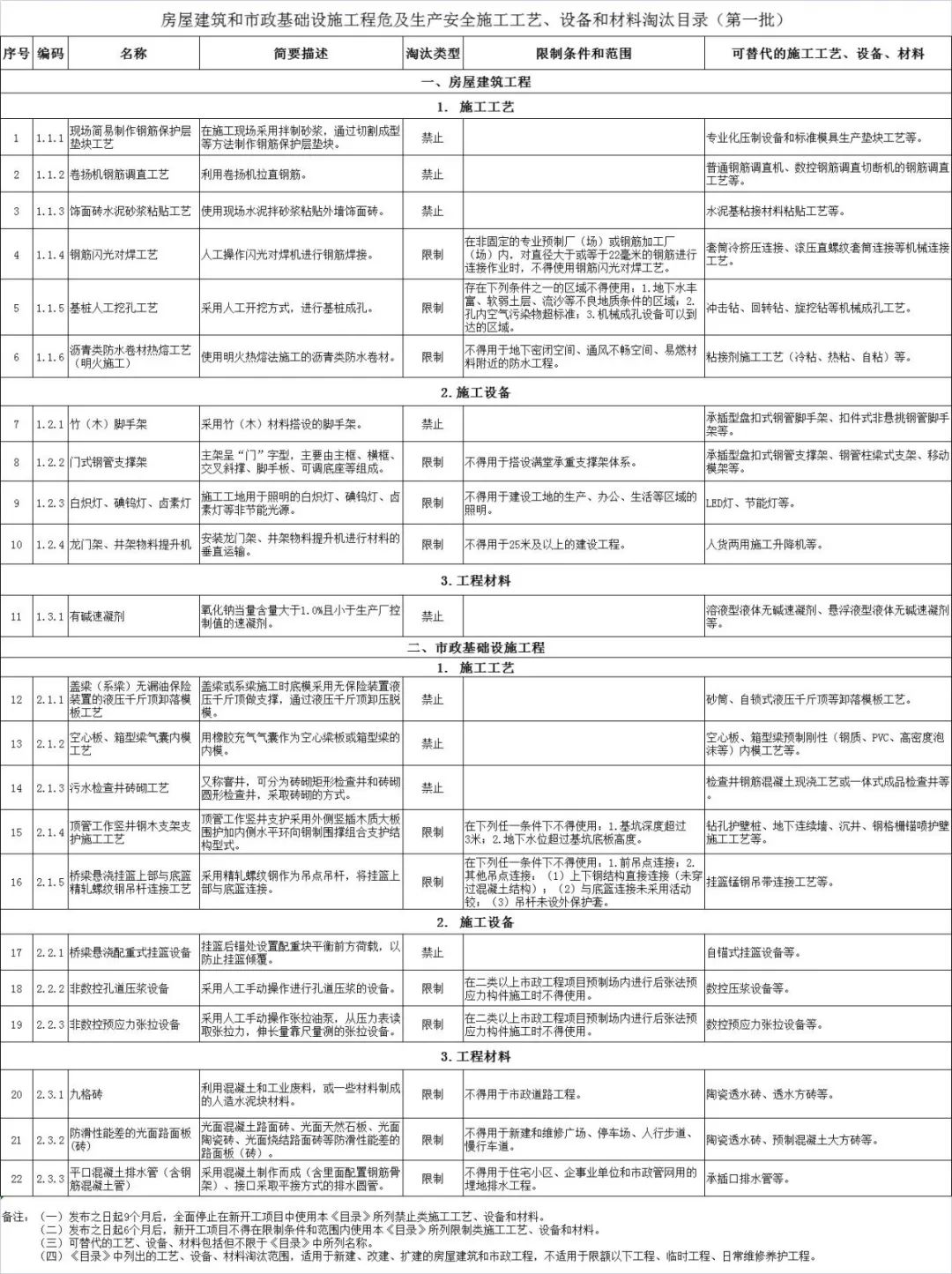 2022年6月15日后,新開(kāi)工項(xiàng)目不得在限制條件和范圍內(nèi)使用《目錄》所列限制類(lèi)施工工藝、設(shè)備和材料。