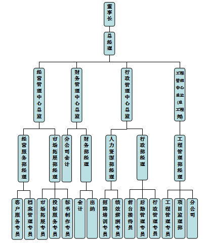 公司按照現(xiàn)代企業(yè)管理模式,建立了科學高效的組織機構,現(xiàn)設“一辦一部四中心”,即總經(jīng)辦、綜合部、工程管理中心、人力資源管理中心、經(jīng)營管理中心、財務管理中心。